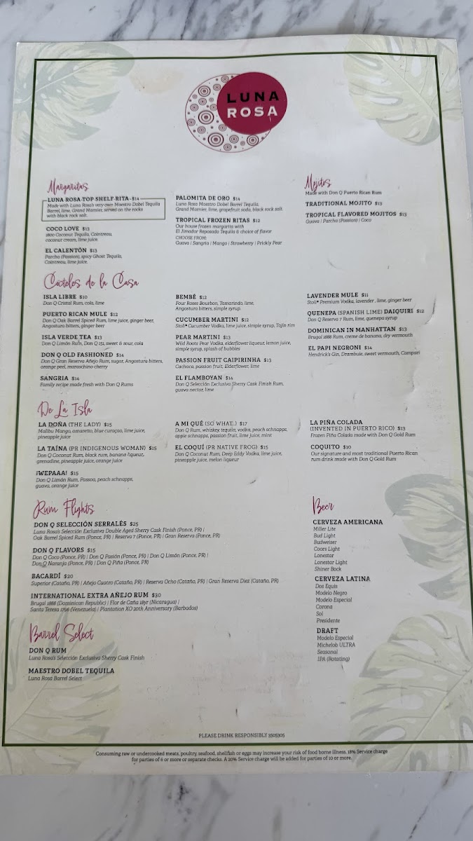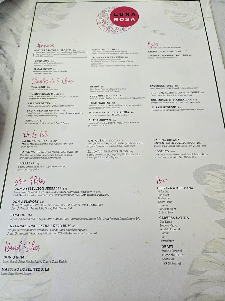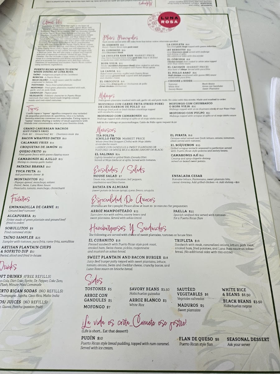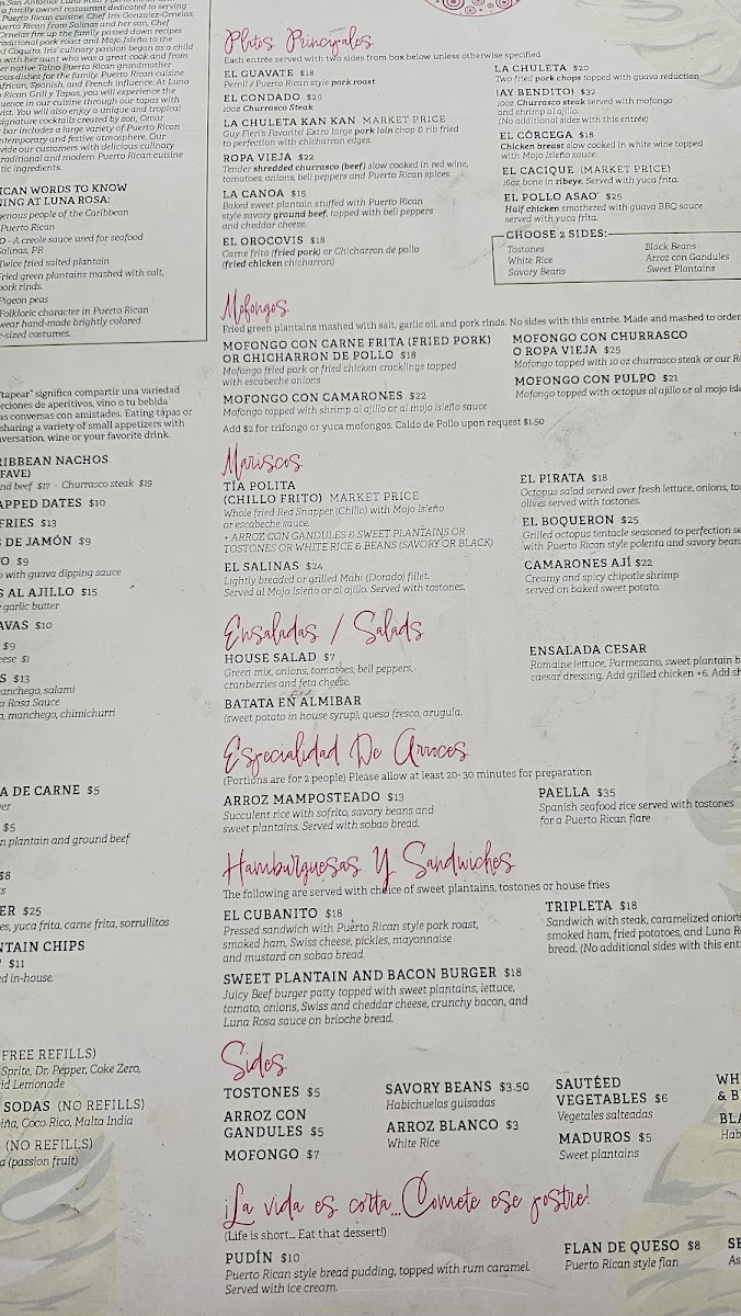 At Luna Rosa Puerto Rican Grill Y Tapas Menu, every dish takes you on a journey through the vibrant and flavorful world of Puerto Rican cuisine. Located at 910 S Alamo St, San Antonio, TX, this restaurant brings the heart of the island to the Texas heartland with its carefully curated menu. Whether you're in the mood for sizzling grilled meats, savory tapas, or a refreshing Puerto Rican cocktail, Luna Rosa offers a unique dining experience. The menu is packed with bold flavors, from crispy tostones to tender mofongo, ensuring there's something for everyone. With a relaxed and welcoming atmosphere, every bite feels like a celebration of the island’s rich culinary heritage.