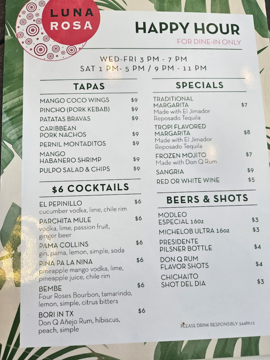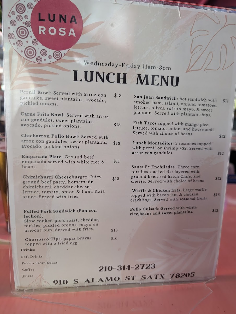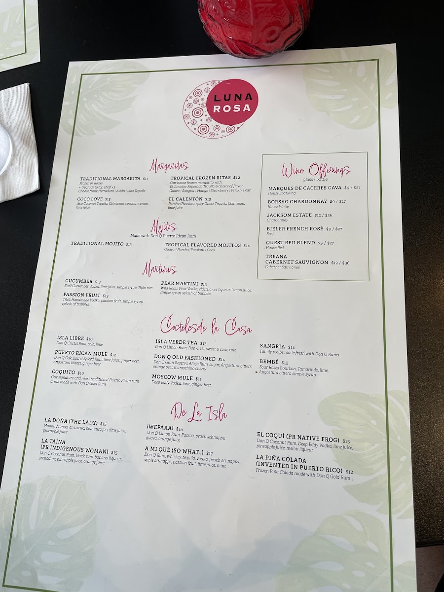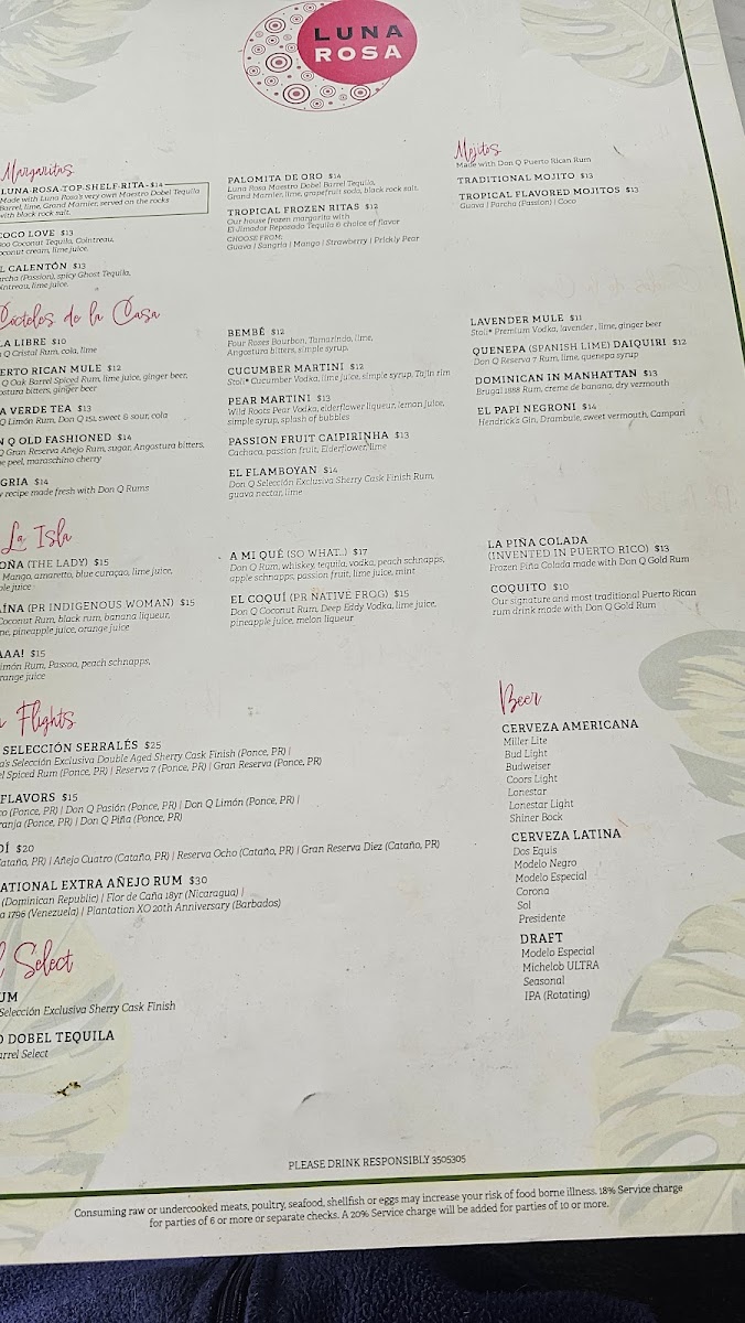 At Luna Rosa Puerto Rican Grill Y Tapas Menu, every dish takes you on a journey through the vibrant and flavorful world of Puerto Rican cuisine. Located at 910 S Alamo St, San Antonio, TX, this restaurant brings the heart of the island to the Texas heartland with its carefully curated menu. Whether you're in the mood for sizzling grilled meats, savory tapas, or a refreshing Puerto Rican cocktail, Luna Rosa offers a unique dining experience. The menu is packed with bold flavors, from crispy tostones to tender mofongo, ensuring there's something for everyone. With a relaxed and welcoming atmosphere, every bite feels like a celebration of the island’s rich culinary heritage.